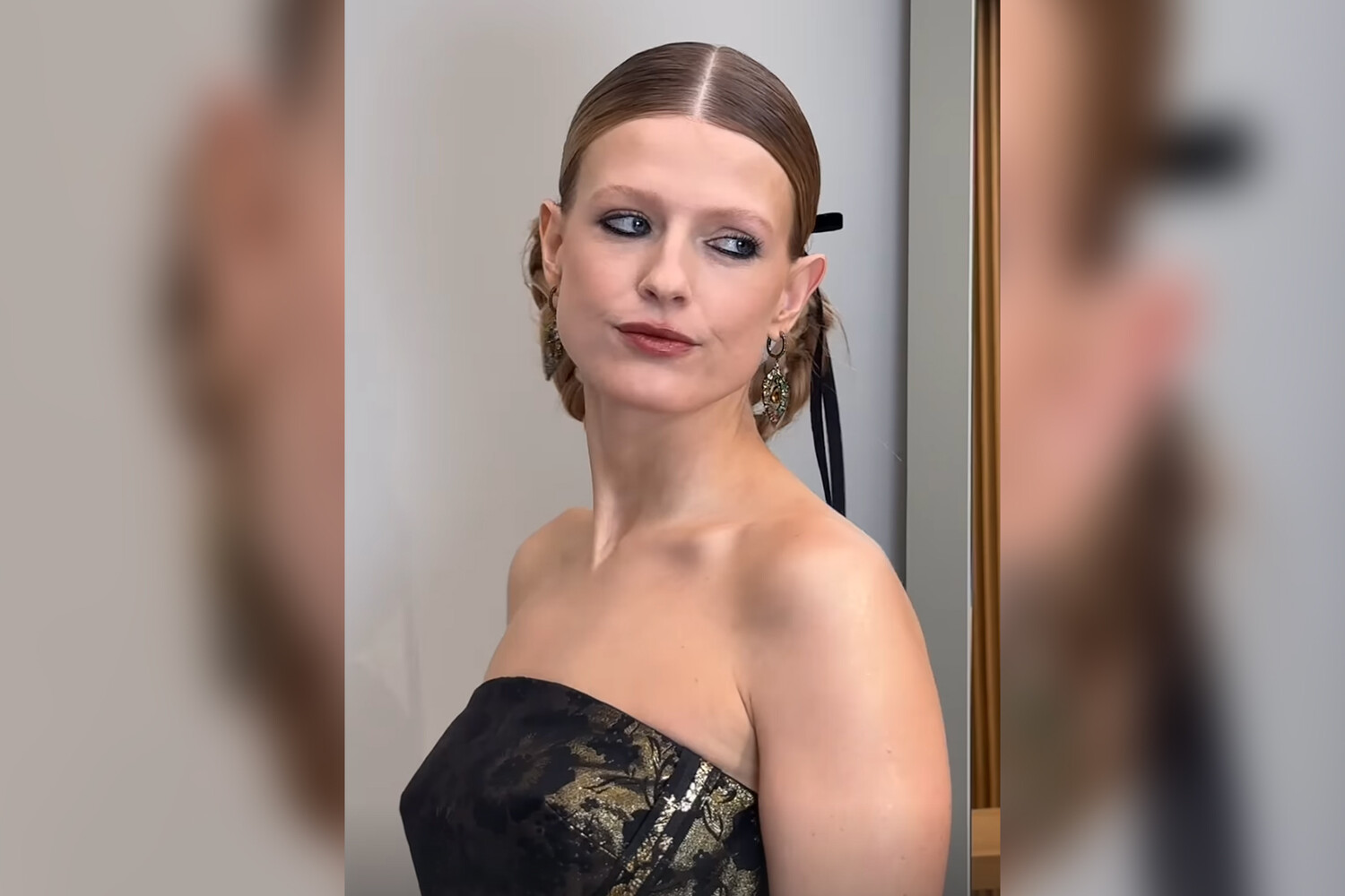 Перед камерой актриса позировала в черно-золотом платье. Образ дополнили туфли на высоких каблуках, браслет и массивные серьги. Ей также сделали укладку и вечерний макияж с черными тенями.