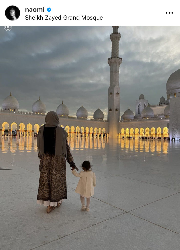На снимке мать и дочь позируют на фоне мечети шейха Зайда в Абу-Даби. Звезда отправилась на отдых в ОАЭ и делиться снимками из отпуска. В кадре супермодель предстала перед фанатами в платке, накидке с леопардовым принтом и сандалиях на плоском ходу. Малышка одета во все белое.