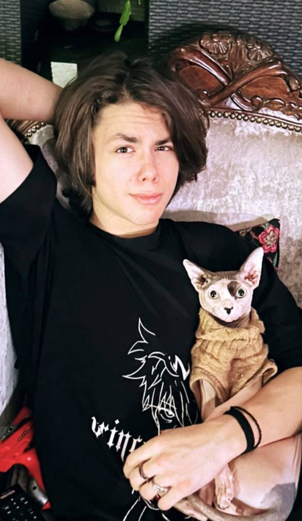 Актриса опубликовала кадр, на котором 16-летний Матвей в черной футболке лежит на диване вместе со своим котом.