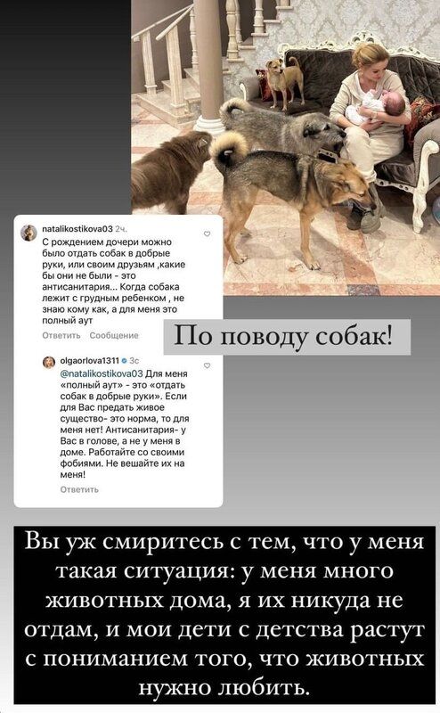 Недавно Орлова опубликовала новый снимок. На фото артистка сидит на диване в уличной обуви, на руках она держит дочь, а вокруг нее стоят собаки. Поклонники тут же принялись обвинять молодую мать в разведении антисанитарии.