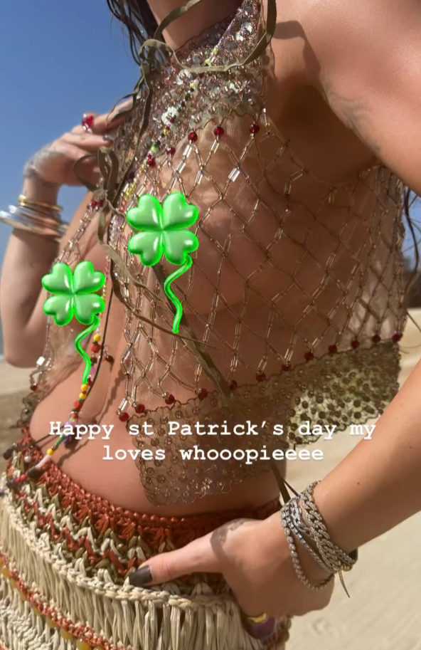Американская певица Рита Ора опубликовала фото в откровенном наряде. На кадрах артистка предстала в прозрачном топе-сетке из бисера и бусин. При том нижнего белья на певице не наблюдалось. Пикантные части тела Рита Ора прикрыла стикерами с листиками клевера.