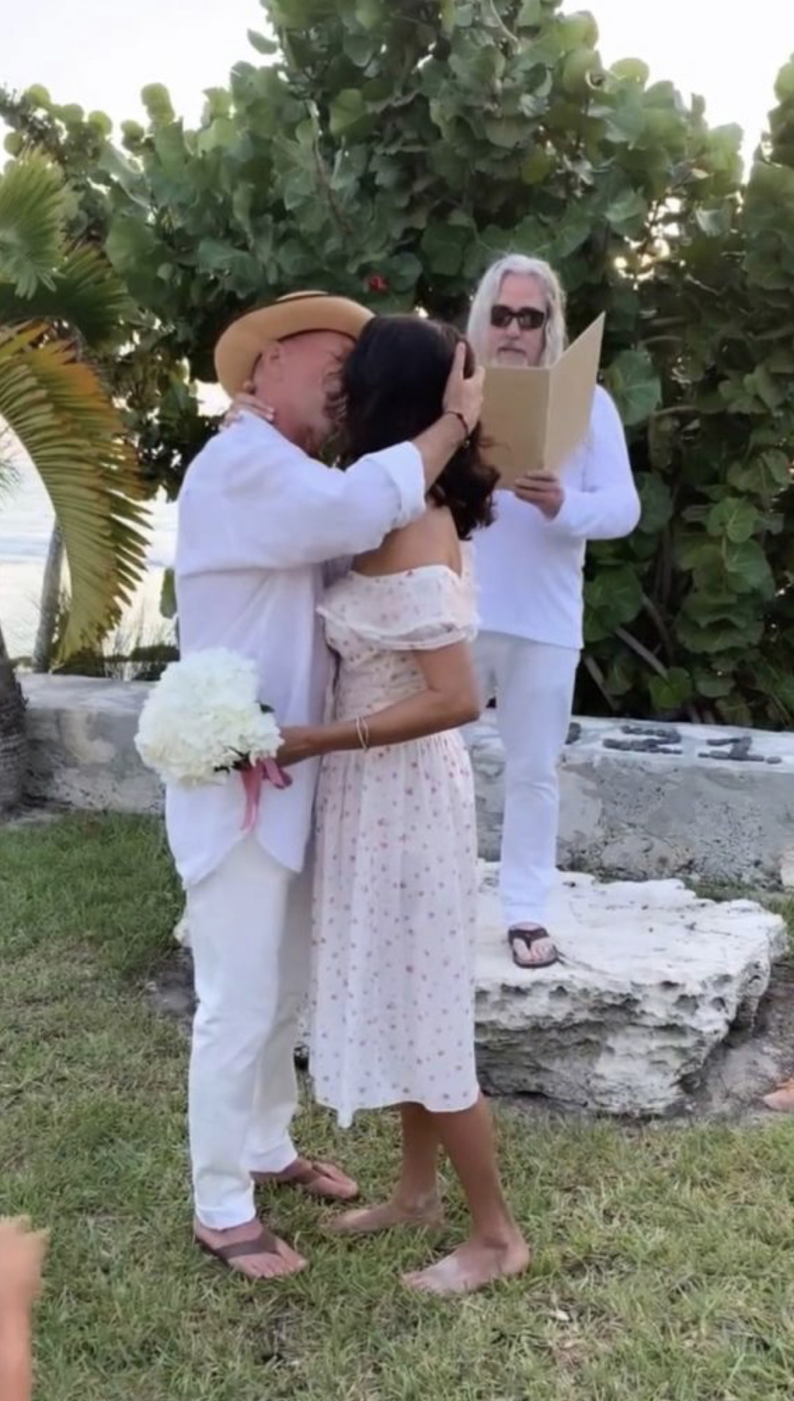 На опубликованном видео Брюс и Эмма были в наряды белого цвета. Звезды вновь признались друг другу в любви и обменялись свадебными клятвами.