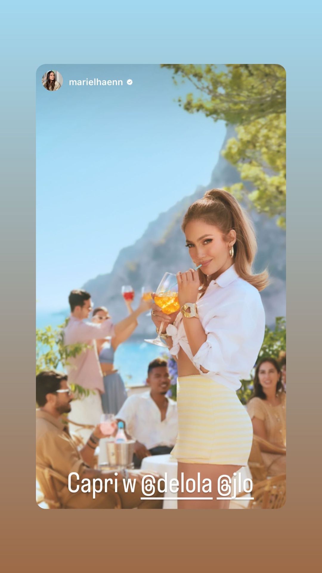53-летняя Джей Ло опубликовала в соцсети видеоролики и серию сториз, посвященных рекламе. Съемки проходили в Италии. В кадре знаменитость сидела на столе и пила коктейль через трубочку. Для ролика актриса выбрала белую рубашку, завязанную под грудью, желто-белую мини-юбку и мюли на каблуке. Дополнили летний образ золотые украшения, собранные в высокий хвост волосы и макияж в бронзовых тонах.