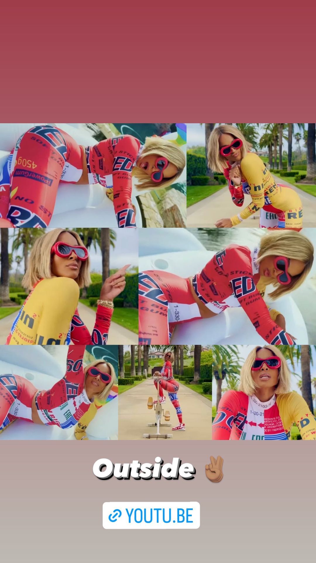 Костюм представил собой облегающий лонгслив и леггинсы в красно-желто-белых цветах. Согласно описанию публикации, комплект, украшенный надписями, вошел в коллекцию весна-лето 2023.