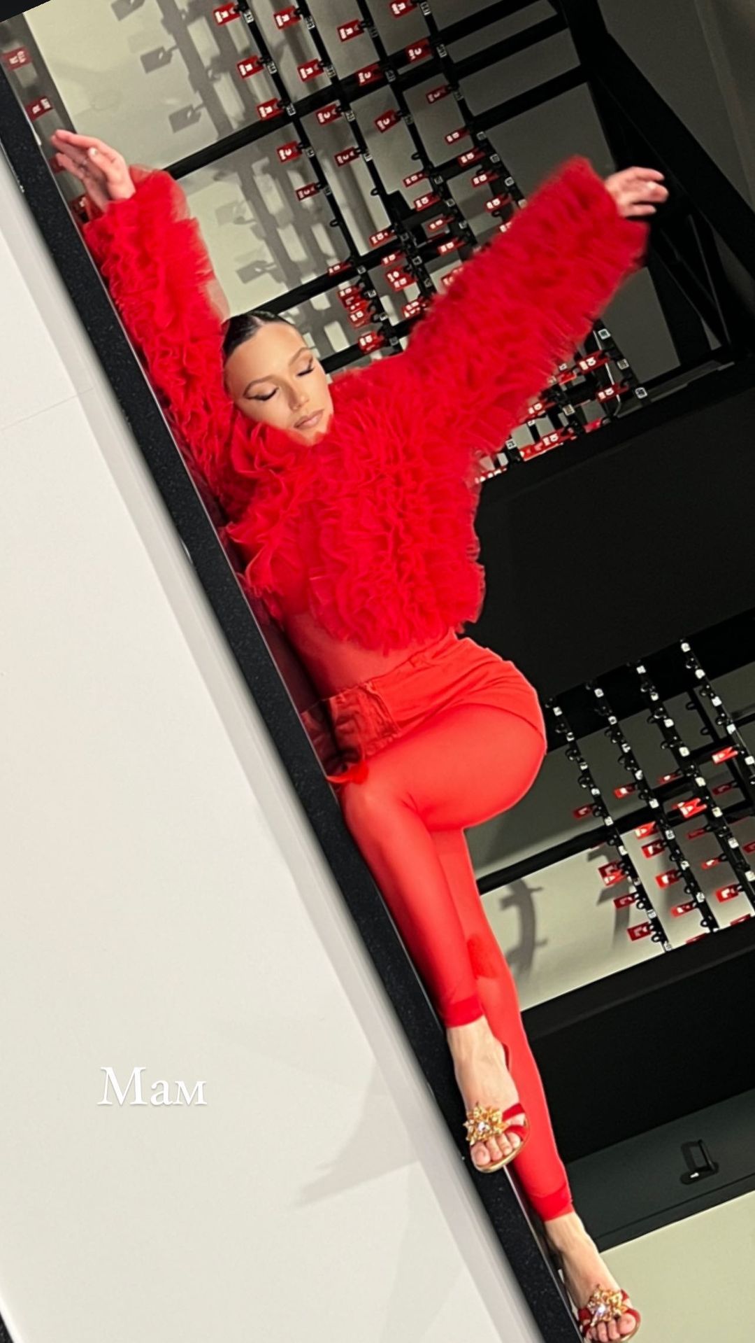 Ярко-красный костюм из боди и облегающих леггинсов с бабочками на коленях подчеркнул формы исполнительницы. Дополнили образ шуба из алого фатина и коралловая мини-юбка. Обувь артистка подобрала в тон образу.