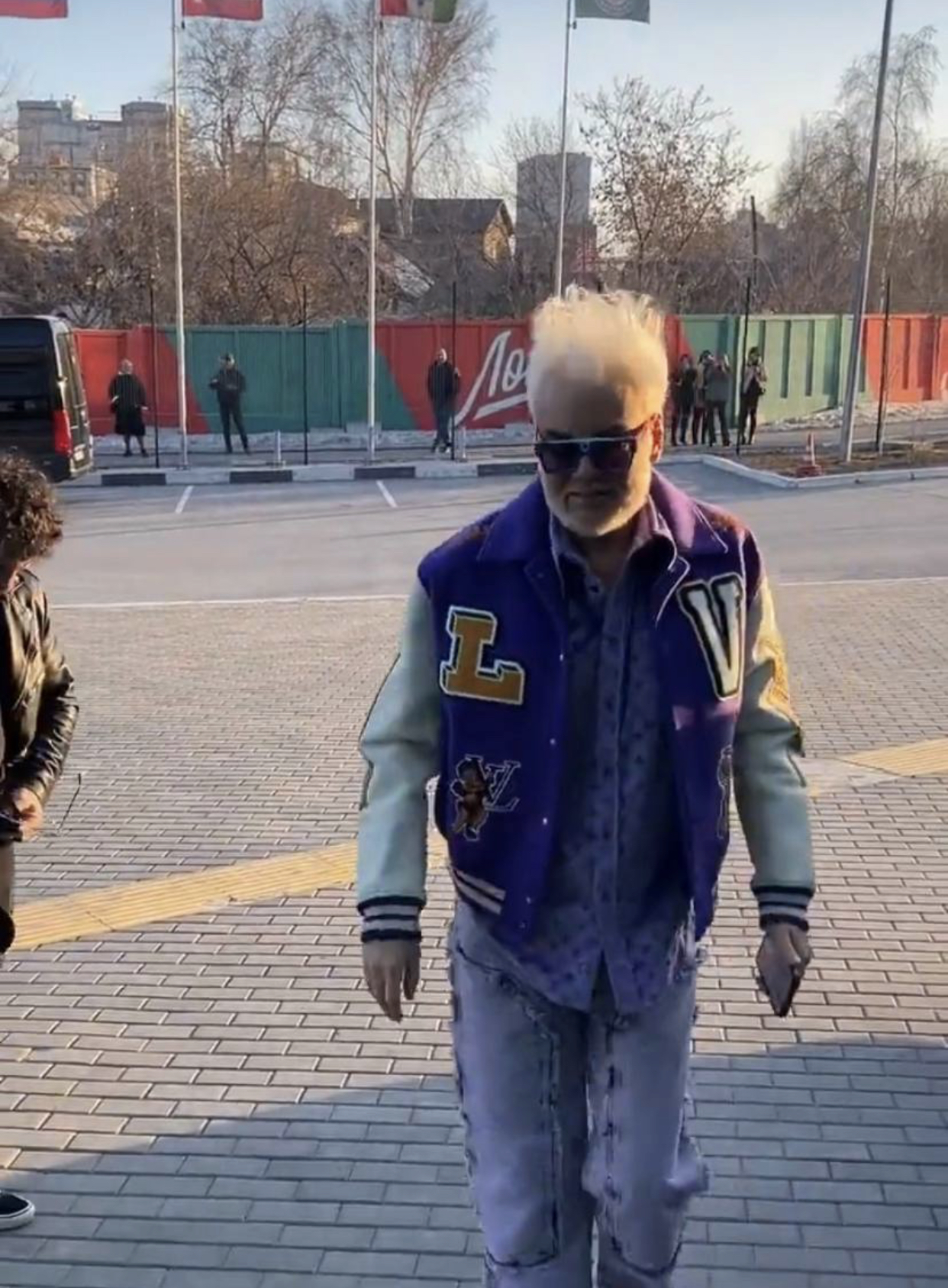 Перед поклонниками Филипп Бедросович появился в черных очках, кожаном берете и кожаной куртке с ярким принтом. Он прибыл в Новосибирск, где должен был состояться его большой концерт.
