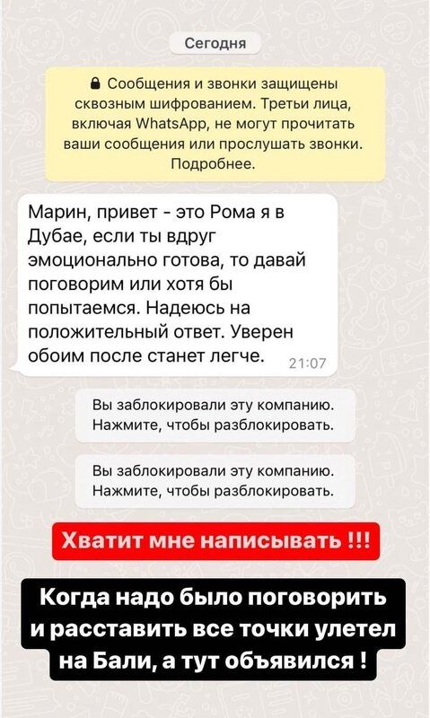 Звезда «Дома-2» Марина Африкантова поделилась с подписчиками перепиской с изменившим ей Романом Капаклы.