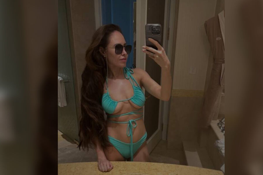 Сегодня брюнетка решила разнообразить контент и опубликовала пикантное фото. На снимке юмористка предстала в откровенном бирюзовом купальнике и больших солнцезащитных очках. Наряд частично оголил грудь юмористки. Снимок она сделала в ванной комнате с приглушенным светом.