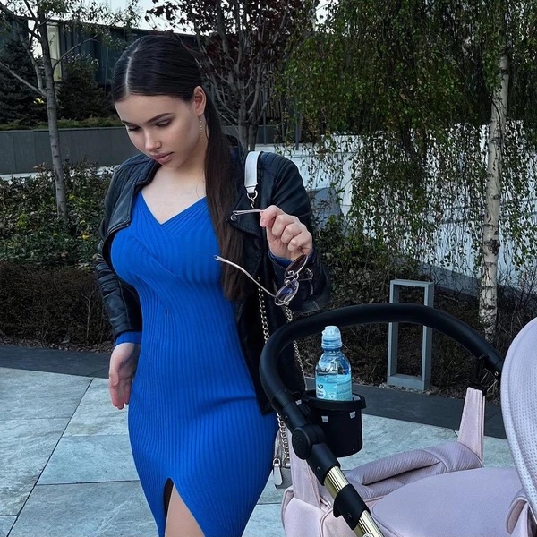 На размещенных кадрах в Сети Ильюхина продемонстрировала облегающей синее платье в рубчик, которое подчеркнуло ее талию. Она вышла на прогулку со своей новорождённой малышкой. В качестве дополнения к образу Мария выбрала кожаную куртку.