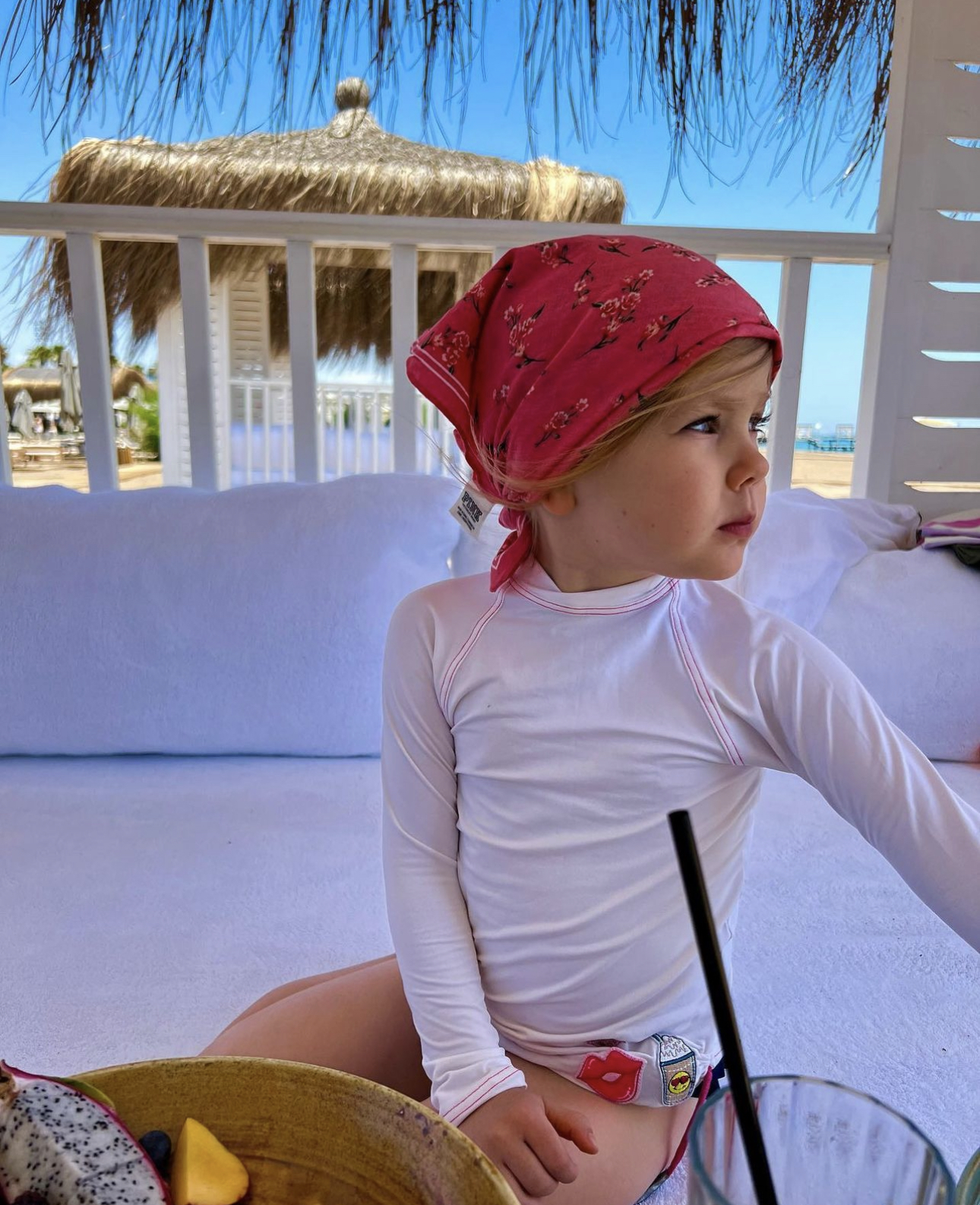 На размещенных фотография в Сети Кудрявцева показала, как ее малышка Маша сидит в беседки возле пляжа и смотрит в сторону.