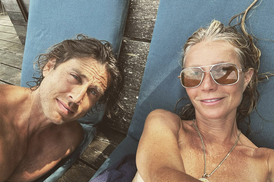 Пелтроу позировала на шезлонге в желтых солнцезащитных очках, с подвеской на шее и без верха от купальника. Рядом с ней загорал и супруг.