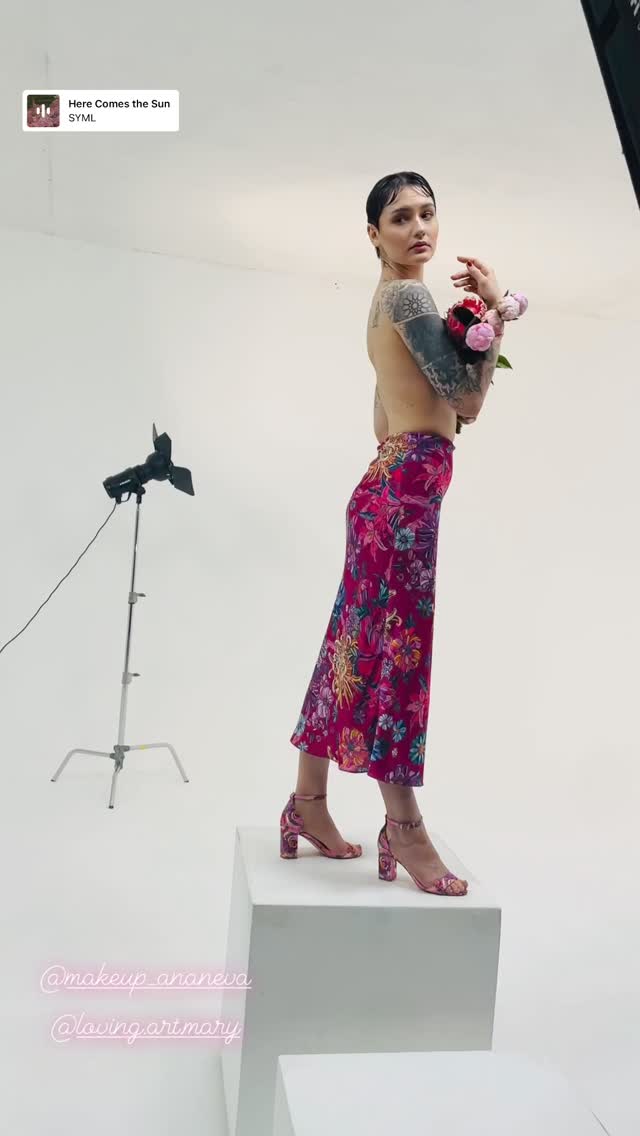 На представленных фото знаменитость показала, как позировала перед камерой топлес. Грудь 24-летняя знаменитость прикрыла объемным букетом цветов. Дополнили образ яркая юбка-миди с цветочным принтом и босоножки на низком квадратном каблуке.