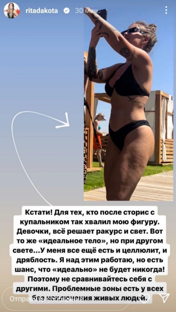 Певица Рита Дакота всегда честна со своими поклонниками. Она не стесняется говорить о своих проблемах и показывать себя без макияжа. На днях артистка продемонстрировала, как ее фигура выглядит без фотошопа.