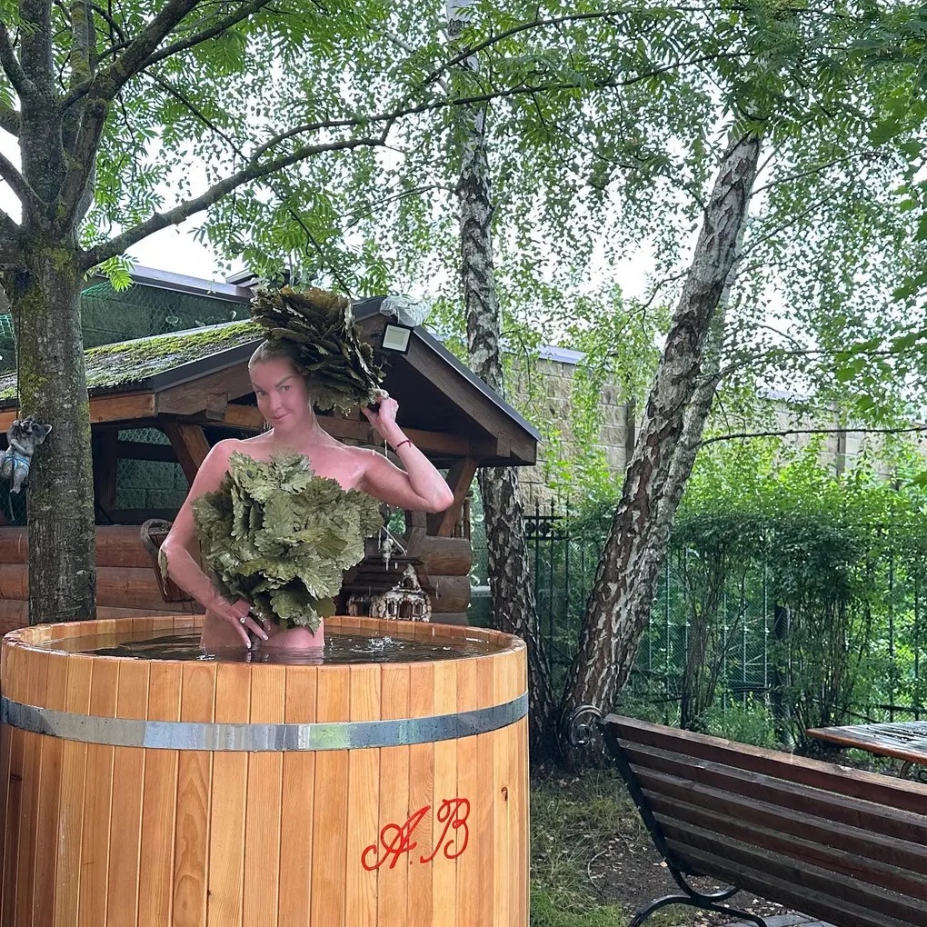 «Холодная именная купель под дождем очень заходит. Недешевое удовольствие… Но качество фантастическое! Ледяная вода придает тонус телу. Особенно в контрасте с парной это уникальная возможность восстановления сил и энергии! А в дневное время ещё и вид красивый на участке нашем», — объяснила танцовщица.