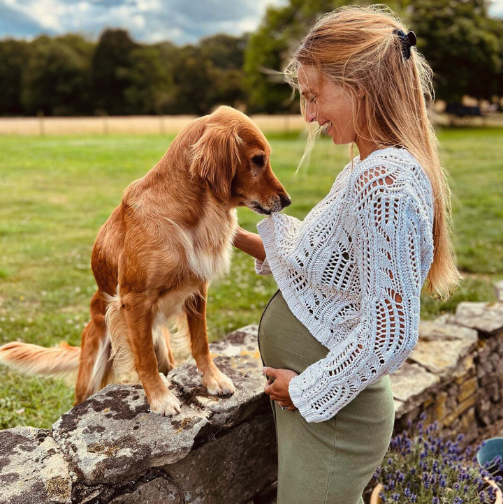 36-летний младший брат Кейт Миддлтон опубликовал фотографию, где его беременная жена Ализе Тевенет позирует вместе с собакой на улице.
