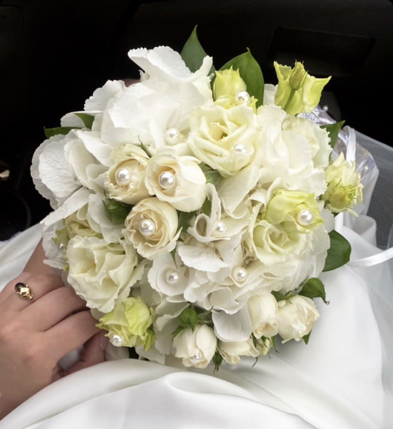 Для свадебного торжества Галина выбрала традиционное белое платье с фатой. Наряд подчеркнул формы девушки. В руках у звездной сестры был букет белых роз.