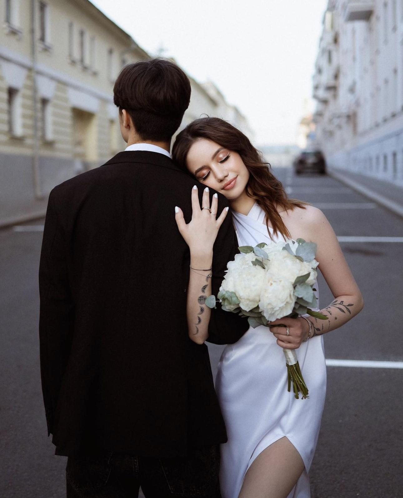 Звезда «Закрытой школы» опубликовала снимки со свадебной фотосессии в личном блоге. Для торжества она выбрала традиционное белое платье с разрезом на ноге. В руках она держала букет. А ее жених предпочел надеть классический черный костюм.
