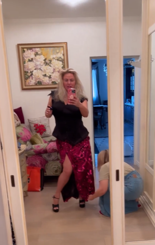 Артистка поделилась видео, на котором позирует в элегантном наряде: черной приталенной блузе без рукавов и бордовой юбке-миди, расшитой стразами и откровенным разрезом на бедре. Дополнили «секси-образ» черные босоножки на высоком каблуке и массивной платформе.