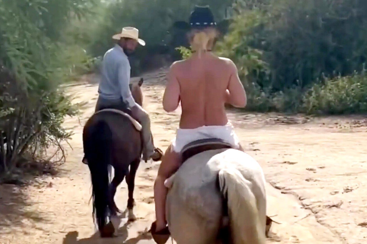Популярная американская певица Бритни Спирс прокатилась на белой лошади в пустыне с оголенным верхом. Видео звезда опубликовала в своих социальных сетях.