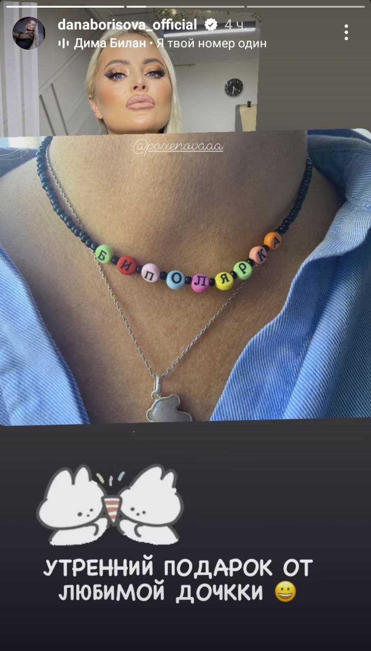 Дана Борисова показала поклонникам подарок от своей дочери Полины. Наследница телеведущей презентовала ей ожерелье с надписью «биполярка» в радужных цветах.