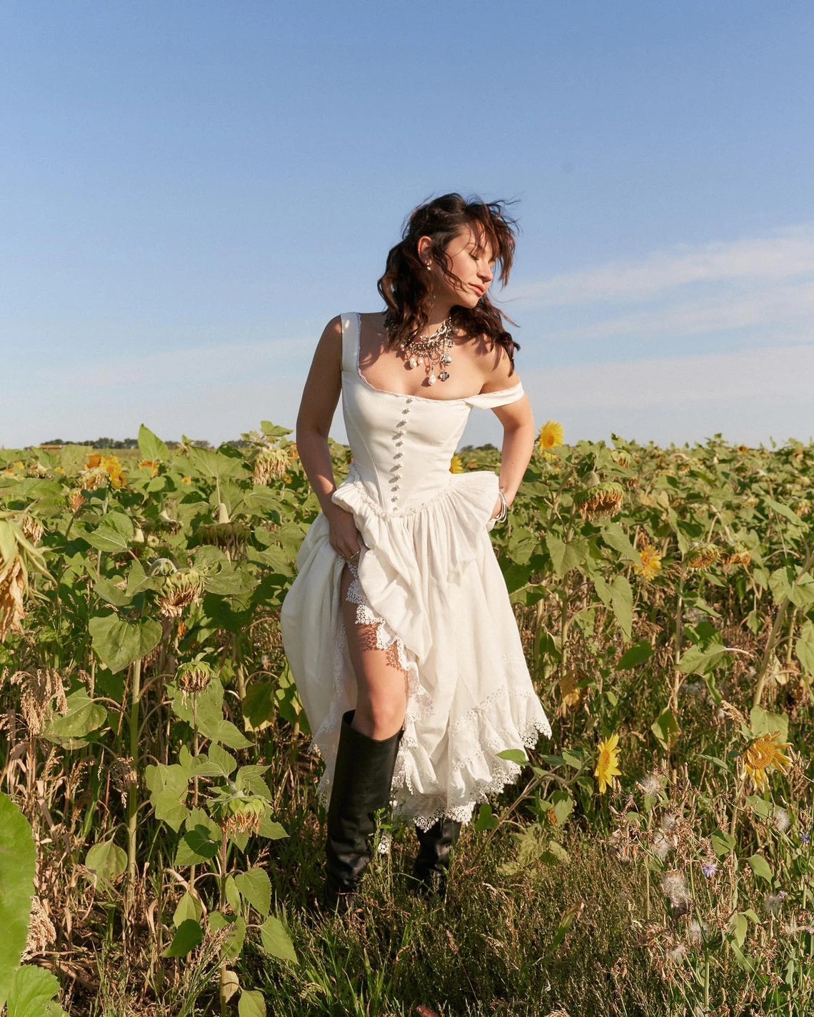 Блогерша надела белое платье с кружевом. В качестве дополнения она выбрала массивные украшения и черные ковбойские сапоги.