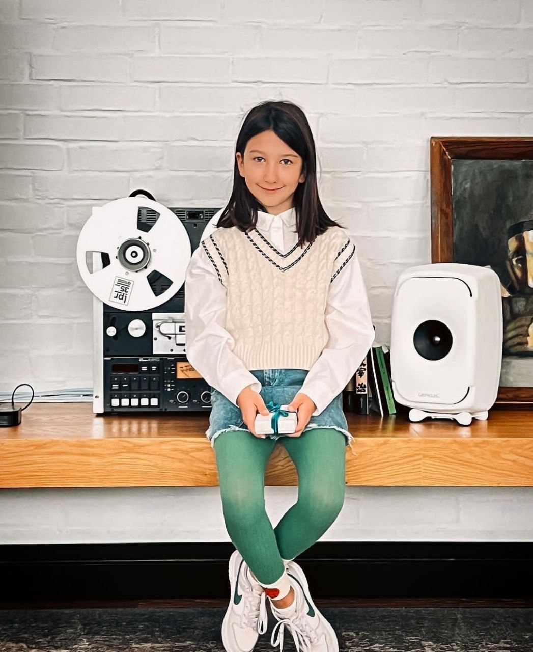 На снимке Валерия позирует сидя на столе в джинсовой юбке, белой блузке, жилетке и кроссовках. В руках у девочки — маленькая подарочная коробочка.