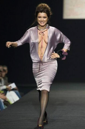 На размещенных кадрах в сети Ксения Бородина шла по подиуму в атласном платье фиолетового цвета с глубоким декольте. В качестве дополнения к образу она выбрала черные колготки и бархатные туфли с золотыми пряжками.