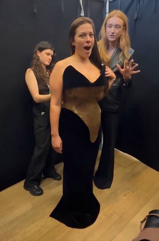 Модель вышла на подиум под акустическую версию Creep группы Radiohead. На Грэм было надето облегающе черное бархатное платье-бюстье в пол с глубоким декольте и золотым корсетом с длинным нижним краем.