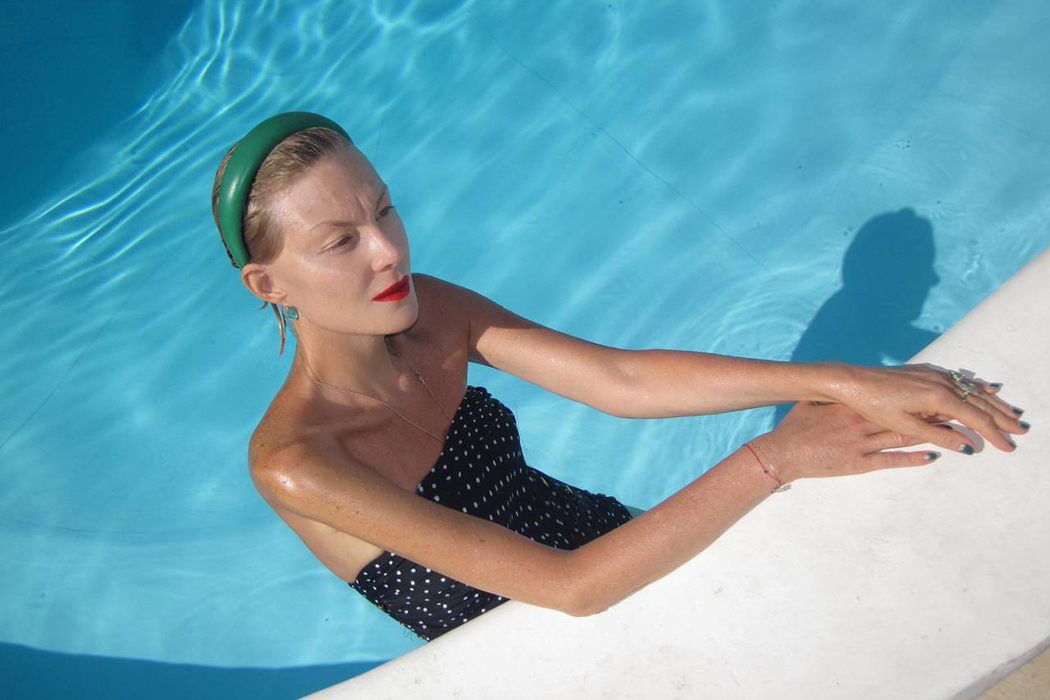 56-летняя артистка поделилась снимком, на котором она позирует в черном купальнике в белый горошек и с зеленым ободком на голове. Фото было сделано возле бассейна.