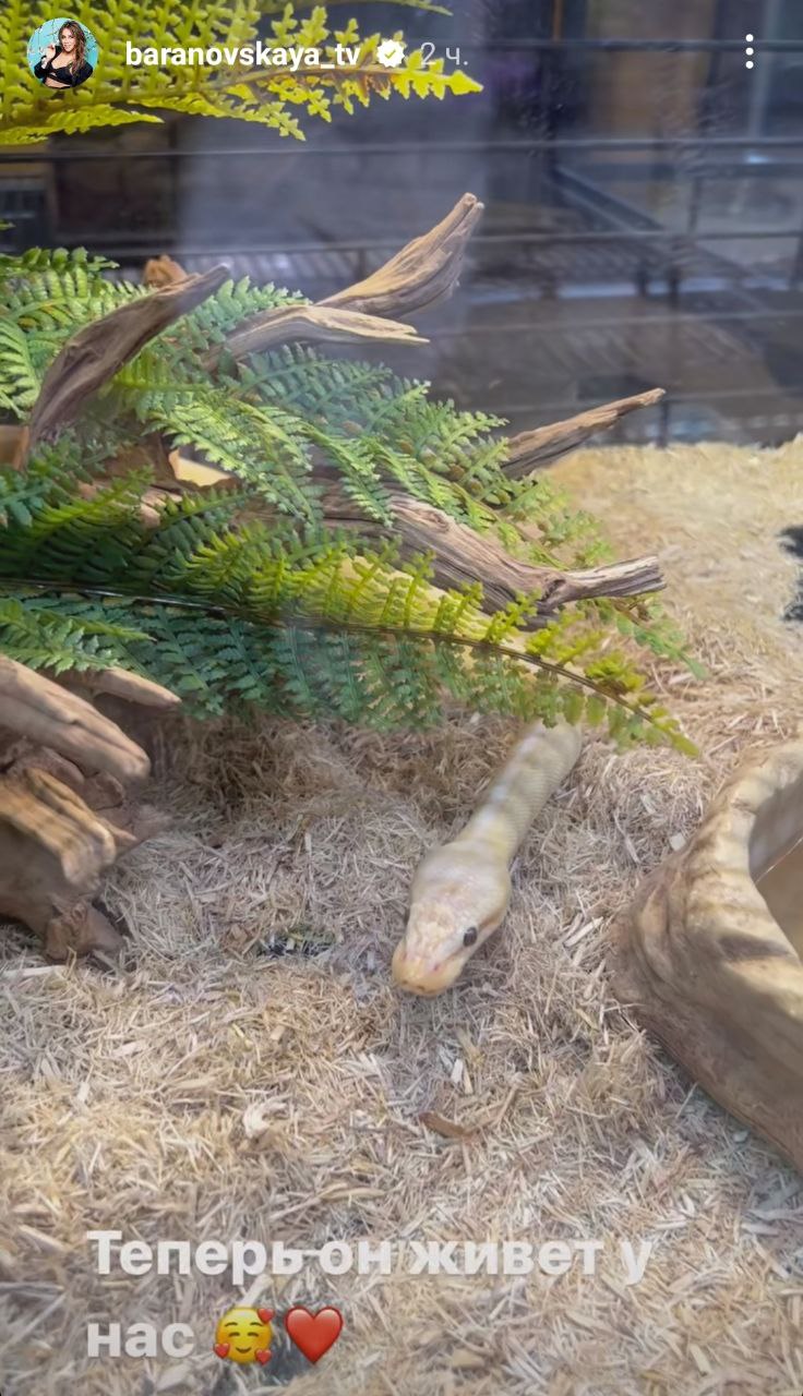 Знаменитость вышла на связь с подписчиками и показала в личном блоге нового члена семьи. «Теперь он живет у нас», — подписала она публикацию. Змея сразу же принялась обживаться на новом месте, и в какой-то момент она зевнула, испугав этим Барановскую. Телеведущая закричала, а затем обратилась к змее, заметив, что она слишком активная.