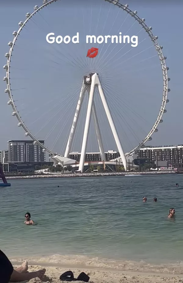 Проскурякова опубликовала серию фото, сделанных на отдыхе. На одном из них она запечатлела вид на песчаный берег и морские волны на фоне колеса обозрения «Дубайский глаз».