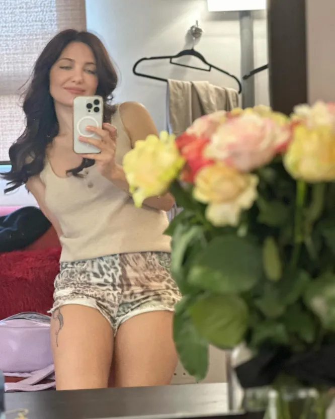 На размещенных кадрах звезда ленты «Мастер и Маргарита» приоткрыла дверь вагончика и выглянула из него. Позже она сфотографировалась в гримерке напротив букета разноцветных роз. Там же Екатерина Климова принимала соблазнительные позы и продемонстрировала свою стройную фигуру и тату на бедре.