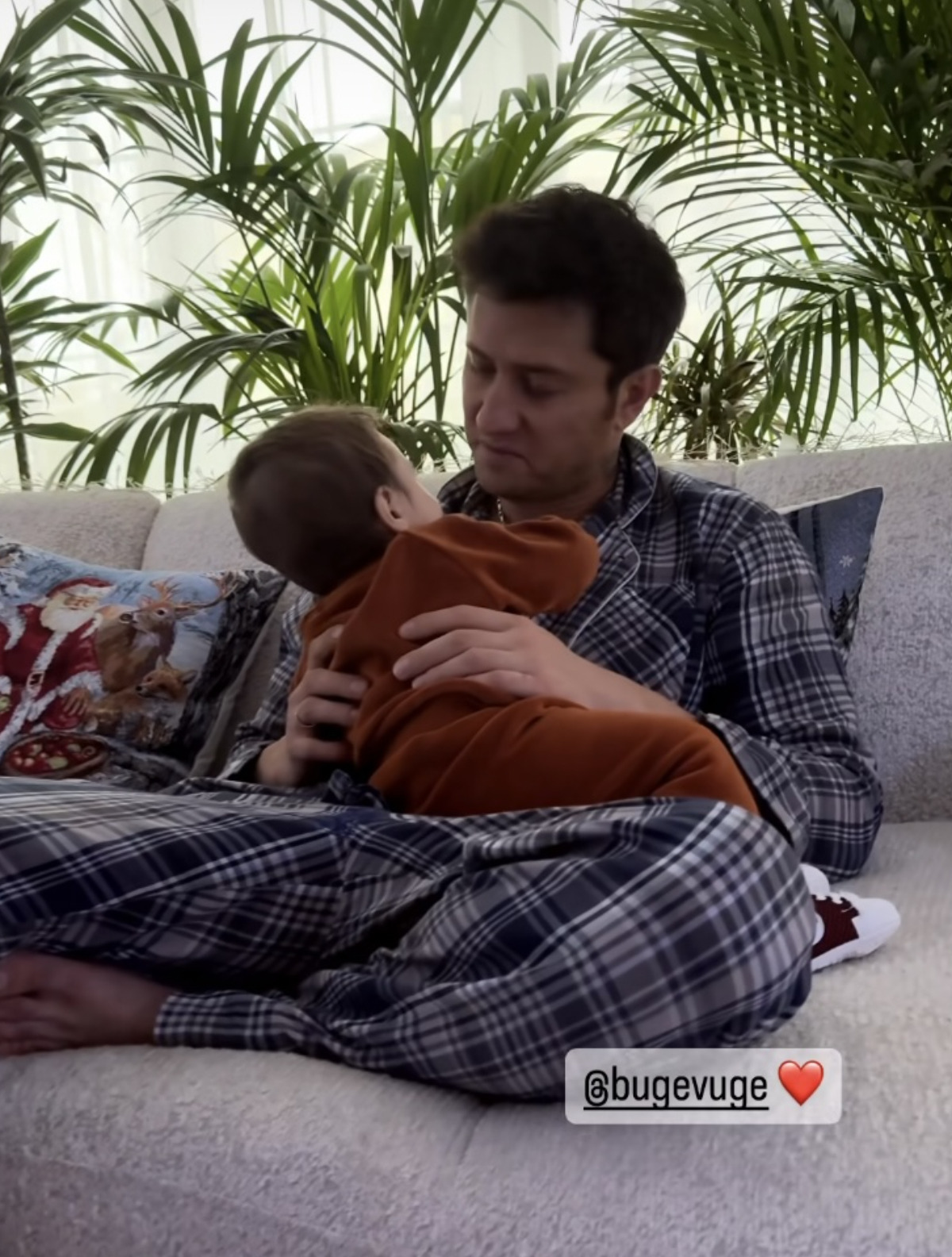 На размещенных кадрах в сети звезда показала, как ее муж Павел Прилучный сидит на диване в клетчатой пижаме вместе со своим сыном Микаэлем. Мальчик уютно расположился на его груди.