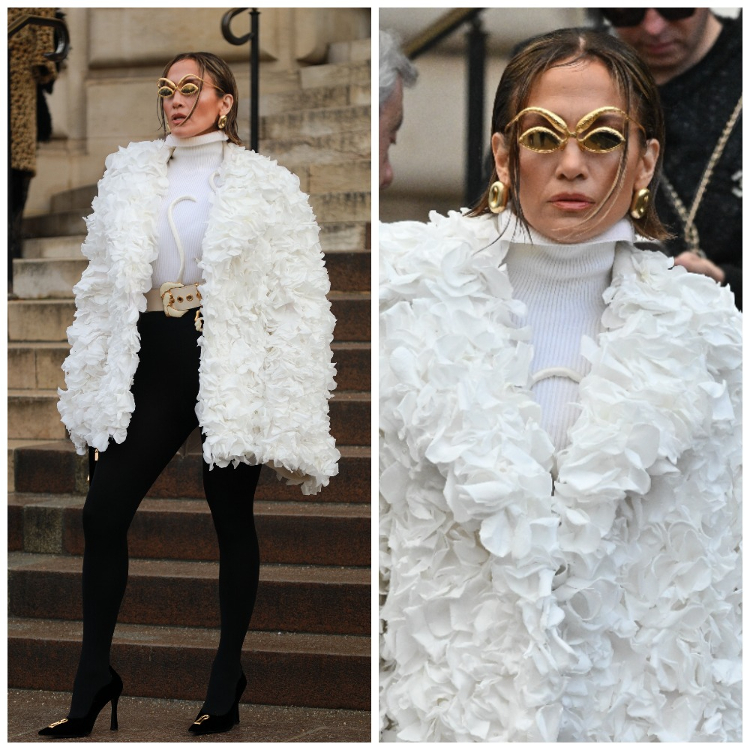 54-летняя звезда посетила показ модного бренда Schiaparelli в Париже. Для выхода в свет Лопес выбрала оригинальный наряд. Она была в легком полушубке белого цвета, белоснежном гольфе с комбинированным воротником и черных плотных колготках. Свой образ Дженнифер дополнила очками в золотистой оправе и бежевым кожаным поясом.