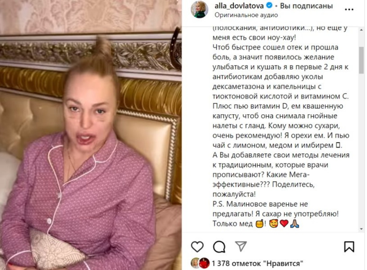 По словам телеведущей, из-за хирургического вмешательства ее начали мучать отеки и гнойный налет. Кроме того, из-за пластики на лице Довлатовой появились большие синяки. Как отмечают журналисты, с каждым днем звезда выглядит все хуже.