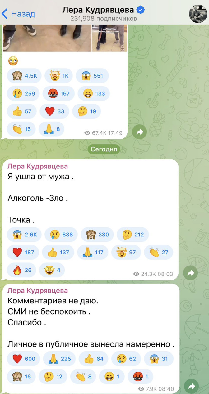 «Комментариев не даю. СМИ не беспокоить. Спасибо. Личное в публичное вынесла намеренно», — добавила Кудрявцева.