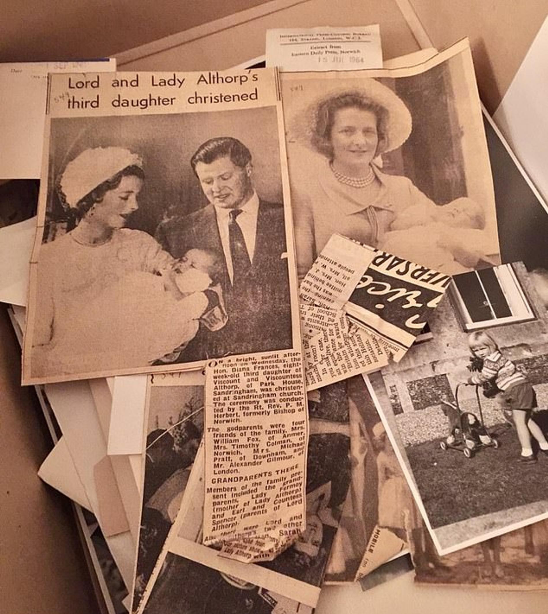 На фото находятся несколько газетных вырезок, посвященных женщине. На одной из фотографий, под названием «Крещение третьей дочери лорда и леди Олторп», изображена маленькая принцесса Диана. Этот снимок был сделан в день ее крещения.