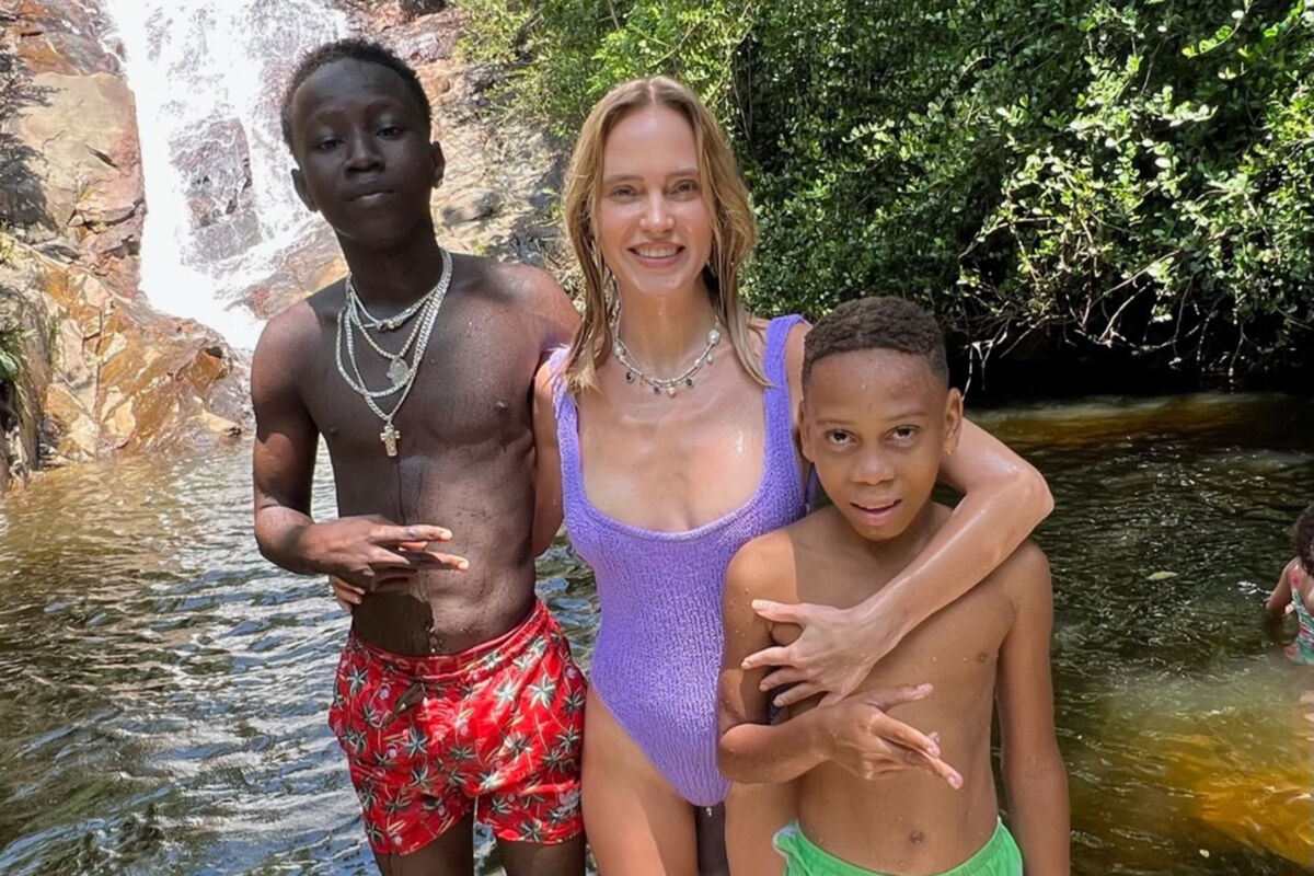 Артистка сфотографировалась на фоне водопада и ярко-зеленой растительности, а рядом с ней стояли темнокожие подростки — местные жители.