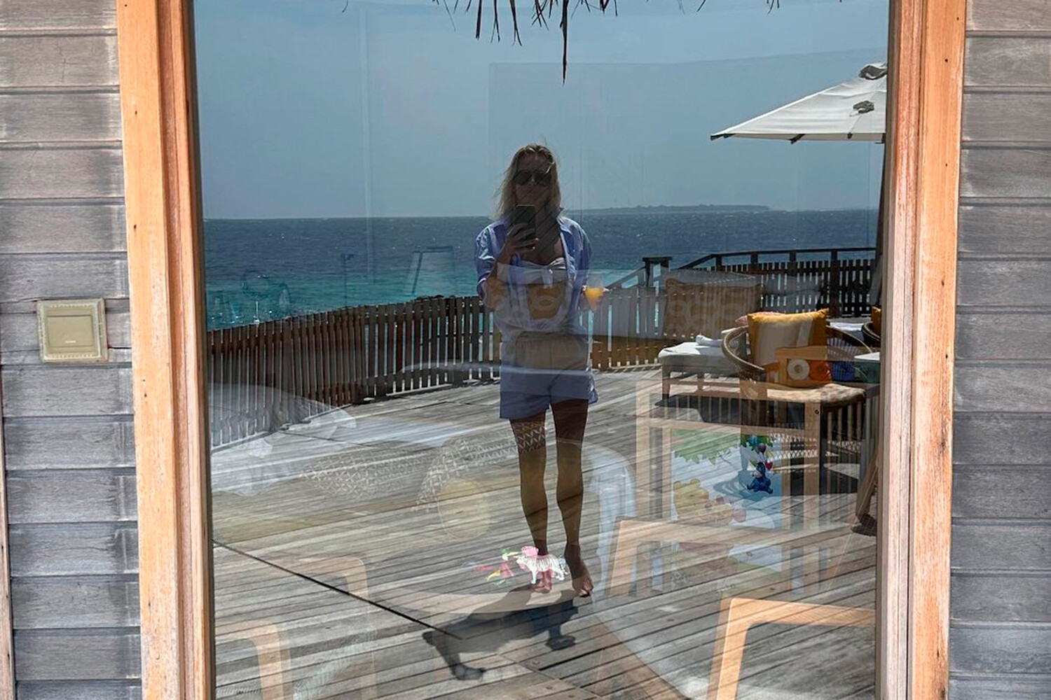 Так, артистка сделала снимок в отражении стекла, позируя в коротких шортах, белом верхе от купальника и голубой рубашке. Образ она дополнила черными солнцезащитными очками, а в руках держала бокал для шампанского. На фоне также отражался берег моря и шезлонги.