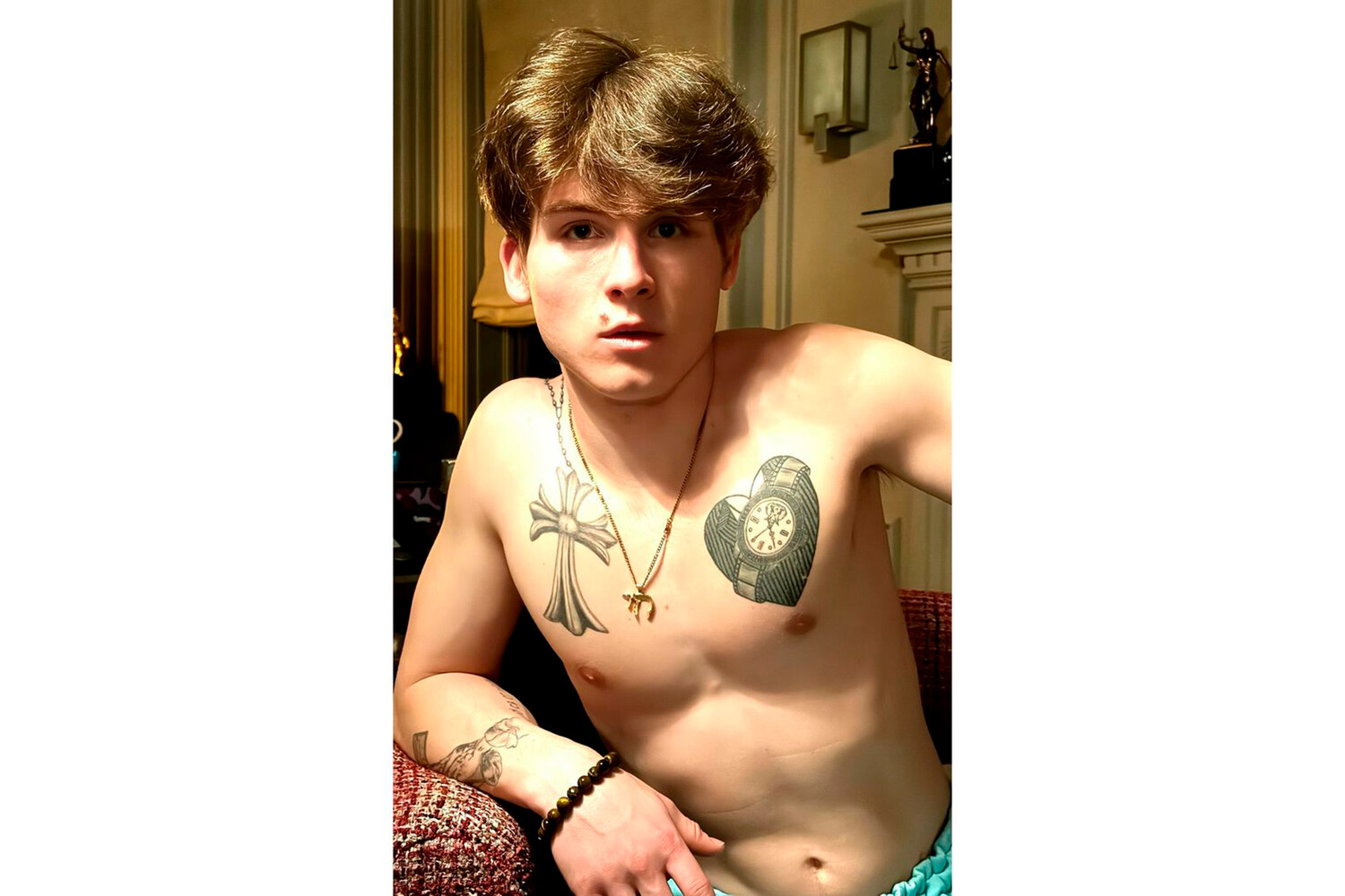 Так, на фото парень позировал с оголенным торсом, благодаря чему были видны его татуировки – сердце с циферблатом часов по центру, а также массивный объемный крест. Одет он был в голубые спортивные штаны, а из украшений предпочел длинную цепочку с подвеской и браслет из камня тигровый глаз.