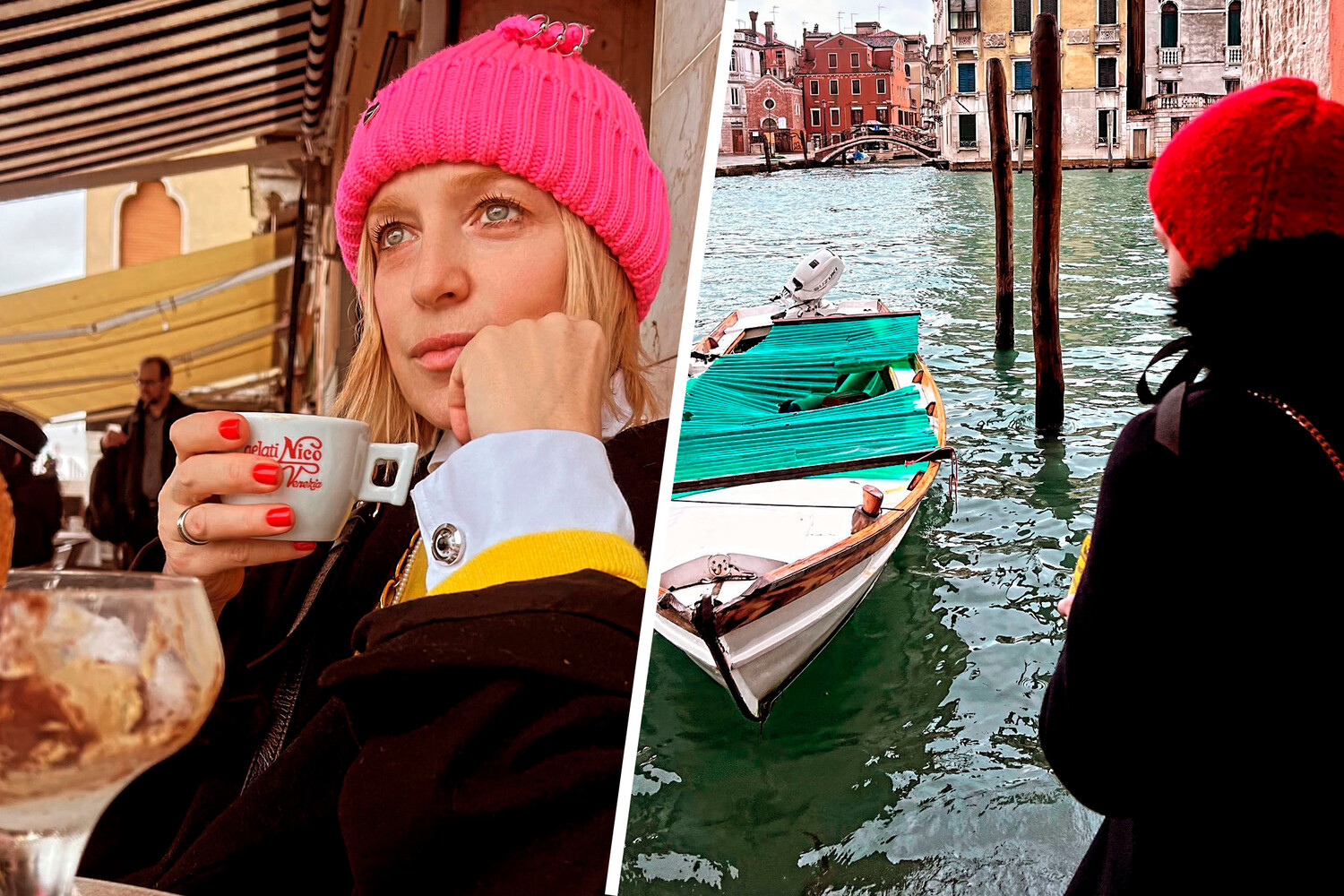 Так как погода в городе сейчас достаточно прохладная, прогулки звезда фильма «Всегда говори всегда» совершает в теплой одежде. На кадрах она позировала в ярко-розовой шапке и пальто на фоне канала и лодки, а также с чашкой в местной кофейне.