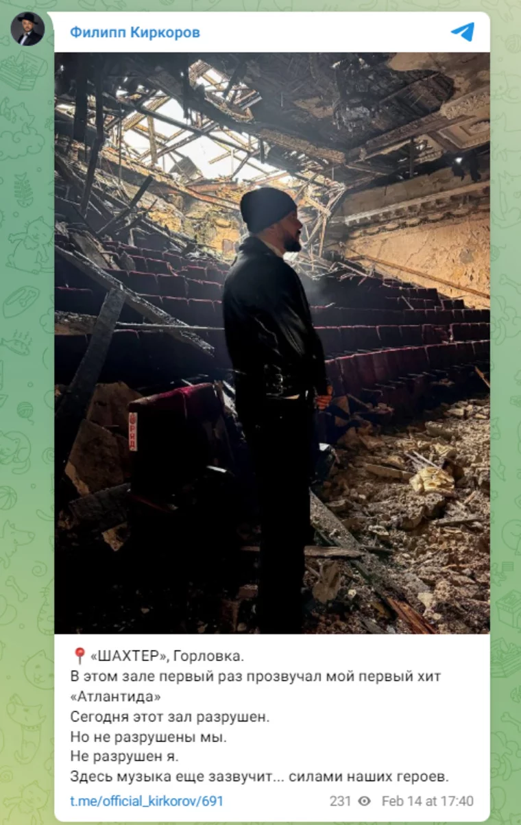 «Сегодня этот зал разрушен. Но не разрушены мы. Не разрушен я. Здесь музыка ещё зазвучит… силами наших героев», — подписал фото Киркоров, отметив, что в этом концертном зале он впервые исполнял свой хит «Атлантида».