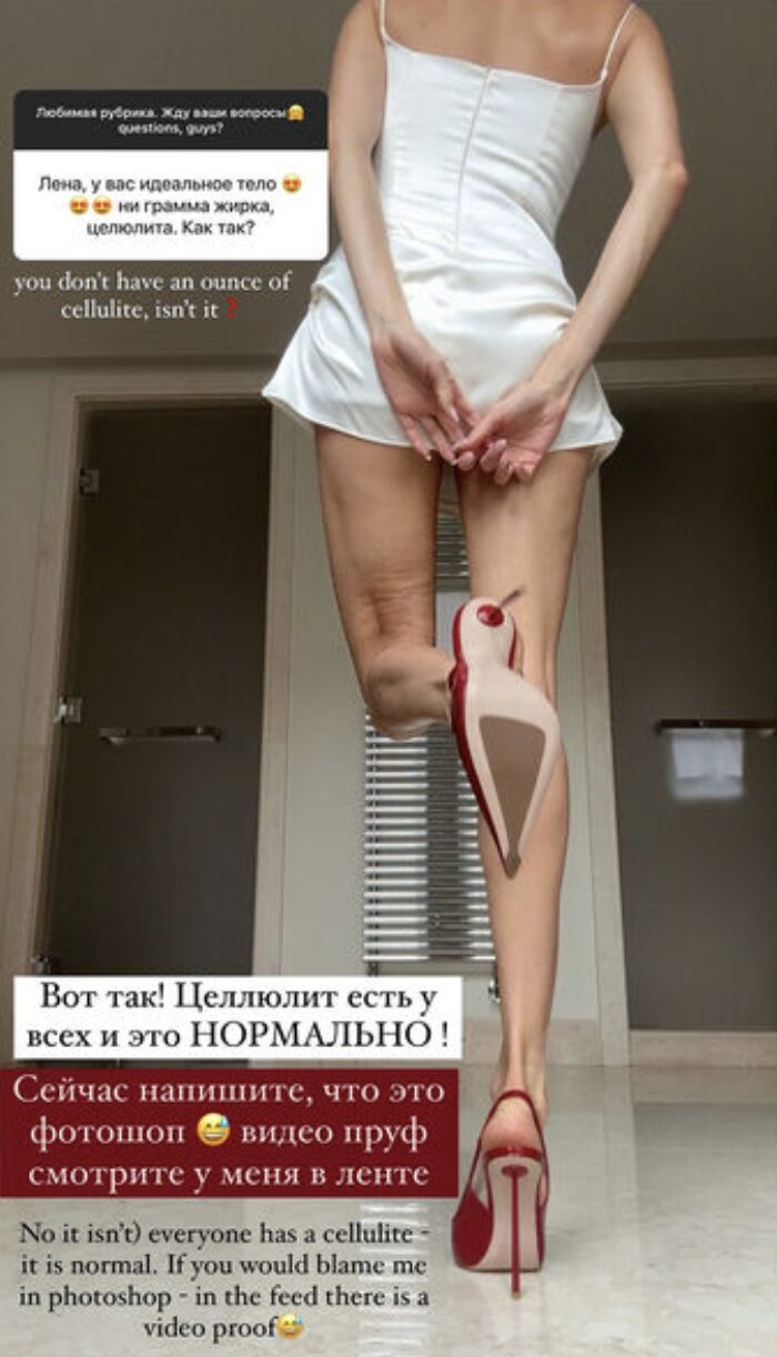 По словам модели, у нее неидеальная фигура. Елена Перминова выложила снимок, на котором предстала в белом облегающем мини-платье и красных туфлях на каблуках. Она стояла спиной к камере и показала целлюлит на ногах.