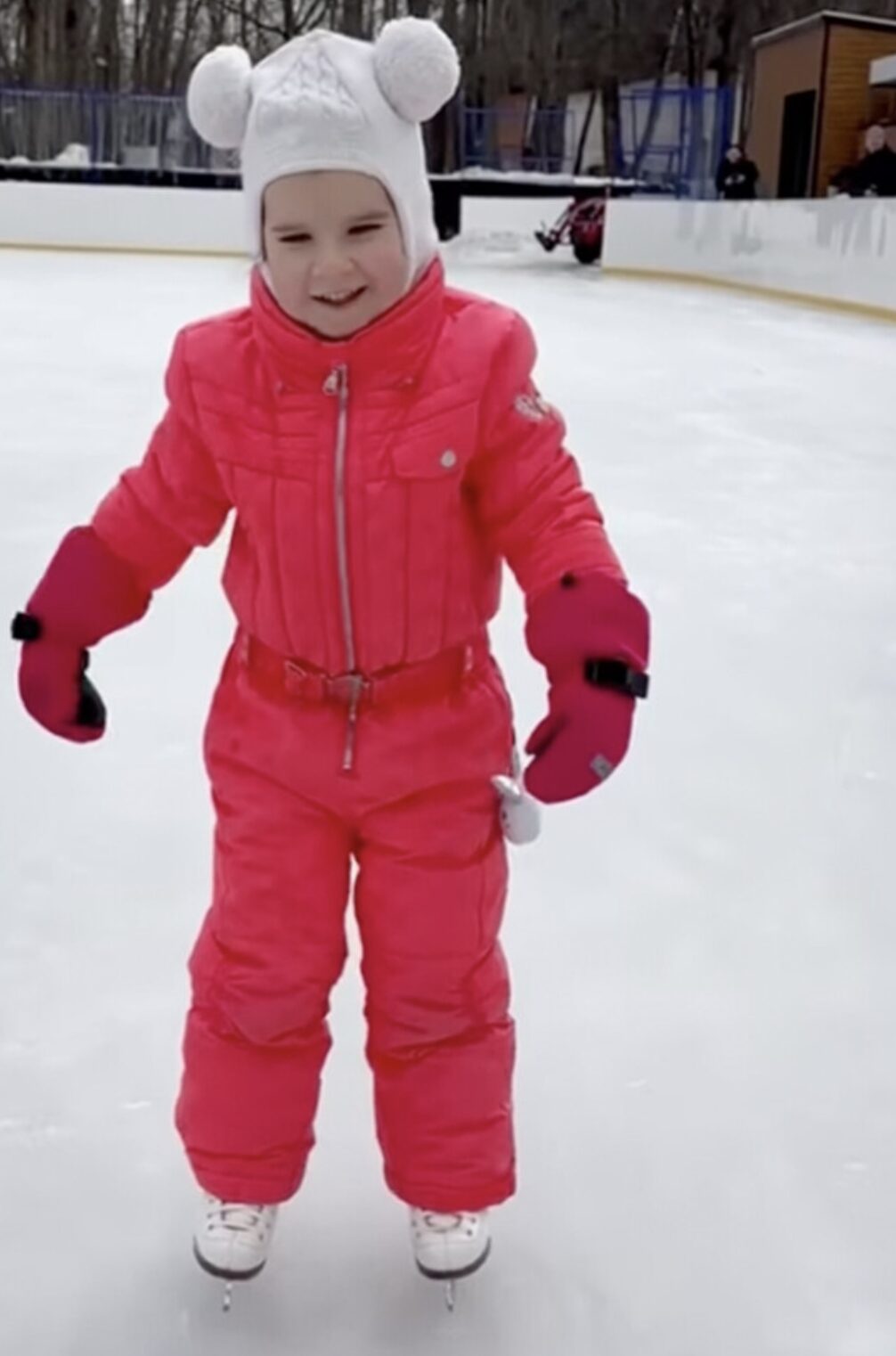 Судя по снимку, многодетная мама хочет, чтобы девочка пошла по ее стопам. Кира уже уверенно стоит на коньках.