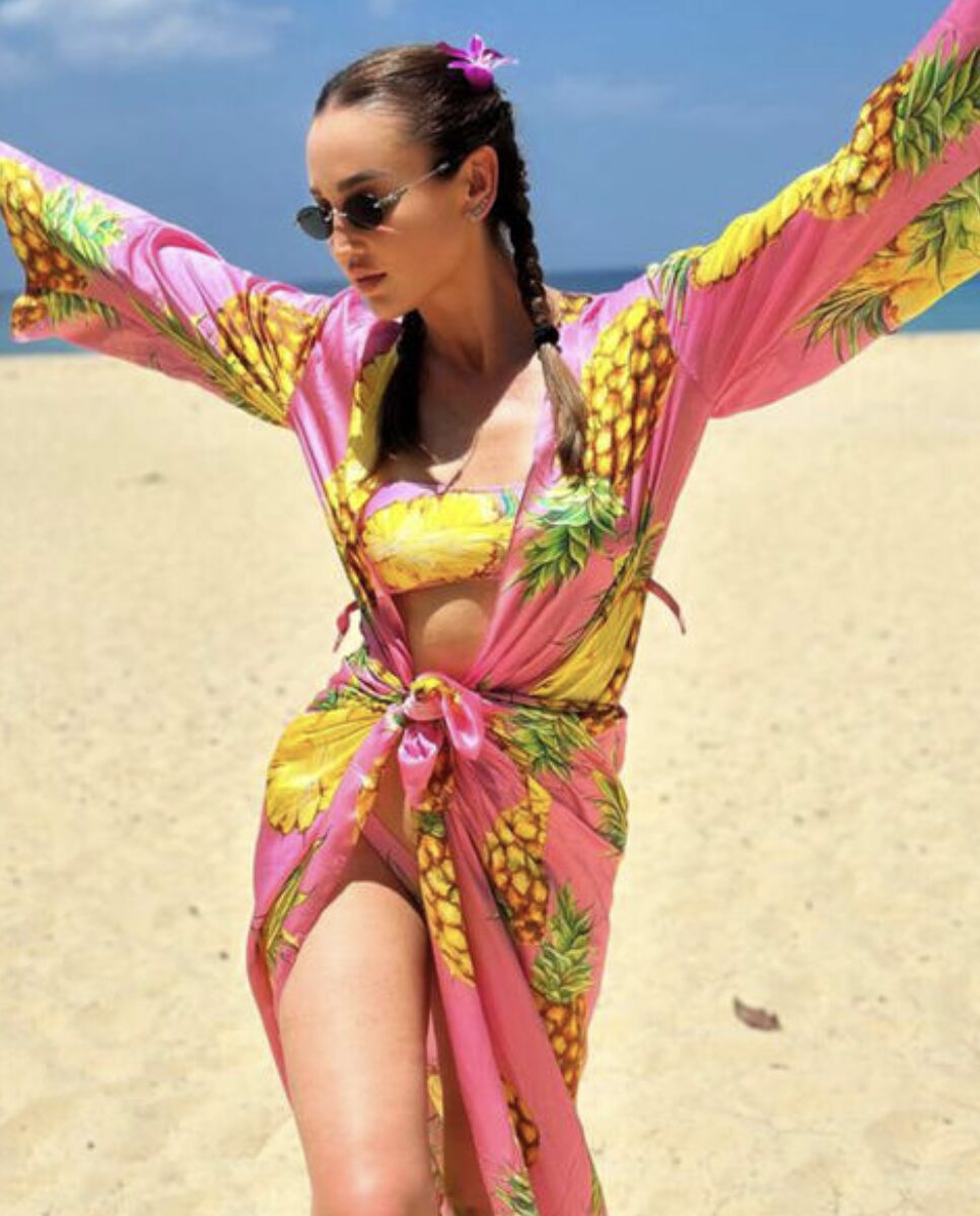 Исполнительница снялась на пляже в ярком наряде, состоящем из халата с принтом из ананасов и раздельного купальника. Она дополнила образ солнцезащитными очками и серьгами, а также заплела волосы в косички.
