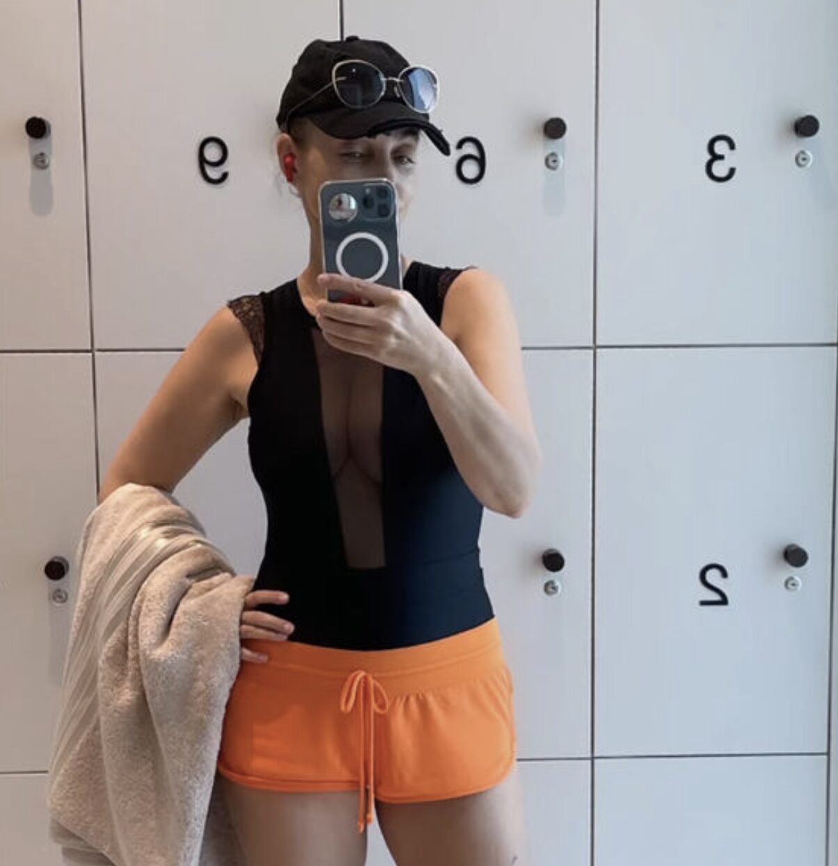 На размещенном кадре в сети супруга музыканта показала, в какой одежде ходит заниматься спортом. Она продемонстрировала черный боди с сеткой на груди и шорты оранжевого цвета.