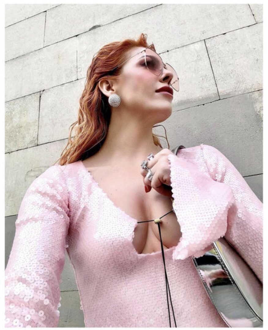 На размещенном кадре в сети знаменитость позировала в наряде в стиле Барби. Певица облачилась в блестящее платье розового цвета с декольте без бюстгальтера. В качестве дополнения к образу она выбрала серебристую сумку и украшения.