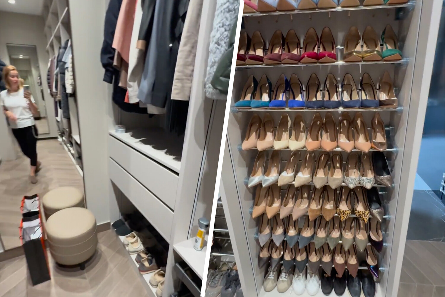 Стоит отметить, что обувь экс-«Блестящая» сортирует по цветам, и большее предпочтение отдает природным оттенкам. В другой части гардеробной были системы хранения для верхней одежды и кожаный пуфик бежевого цвета возле зеркала.