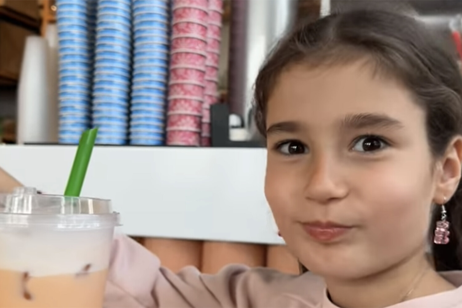 На снимке видно, как девочка пьет бабл-ти в ресторане. Оливия была одета в пудровый лонгслив с бусинами. Также у нее были розовые серьги в виде мишек.