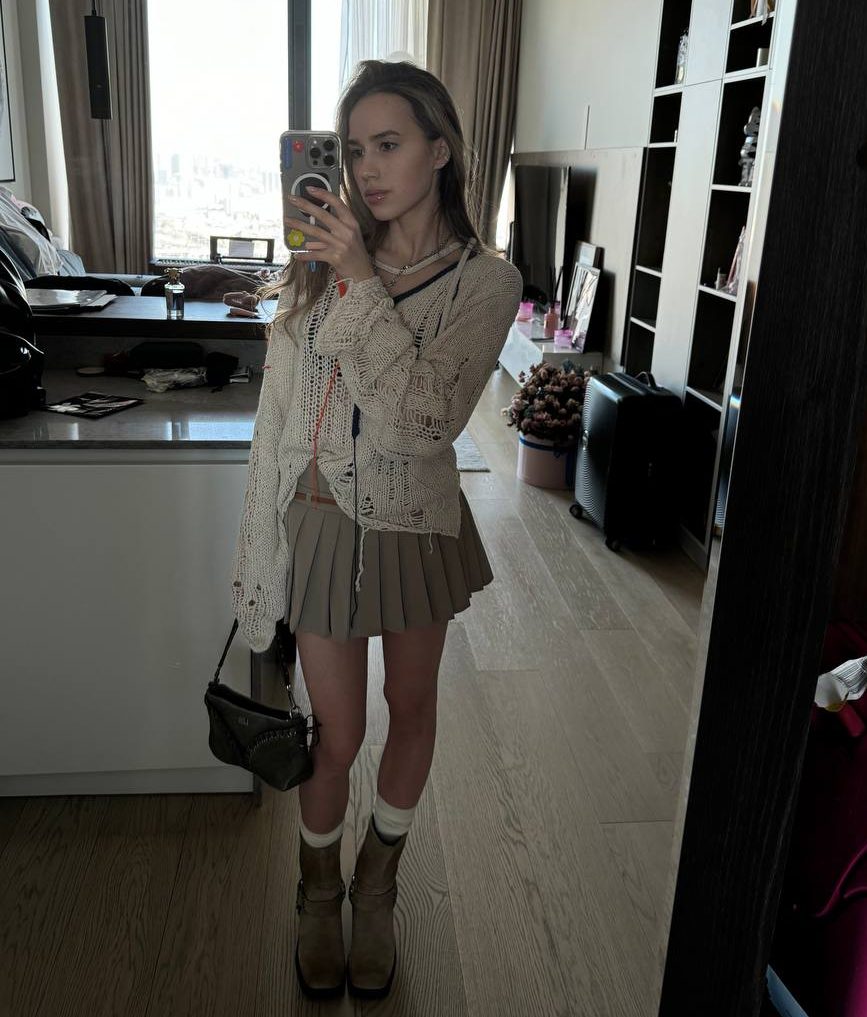 На размещенном фото в сети спортсменка запечатлела себя в зеркало в модном образе, состоящем из юбки песочного цвета и рваного топа. На ее ногах красовались бежевые ботильоны.